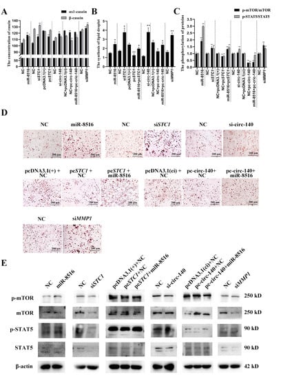 3.6. Circ-140/chi-miR-8516/STC1-MMP1 Modulates the αs1-/β-casein Secretion and Lipid Formation of GMEC