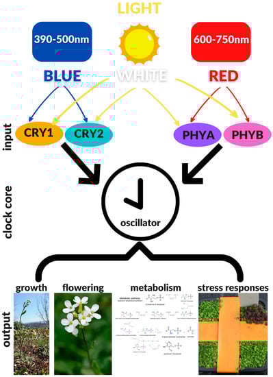 Schematic representation of the Arabidopsis circadian clock, depicting the three principal components of the circadian machinery: The INPUT system—cryptochromes (CRYs) and phytochromes (PHYs)—that receives light stimuli and entrains the clock; the CLOCK CORE that generates 24-h self-sustained oscillations, also in absence of environmental stimuli; the OUTPUT system that adapts the developmental and physiological responses of the plant to the circadian fluctuations. Images from: https://commons.wikimedia.org/wiki/File:Arabidopsis_thaliana_sl10.jpg; https://commons.wikimedia.org/wiki/File:Metabolic_pathway-_pyridoxal_5%27-phosphate_biosynthesis_I_v_2.0.svg; https://commons.wikimedia.org/wiki/File:Arabidopsis_thaliana_JdP_2013-04-28.jpg; https://commons.wikimedia.org/wiki/File:Plants_that_change_color_and_mark_buried_explosives.jpg (accessed on 18 March 2021).