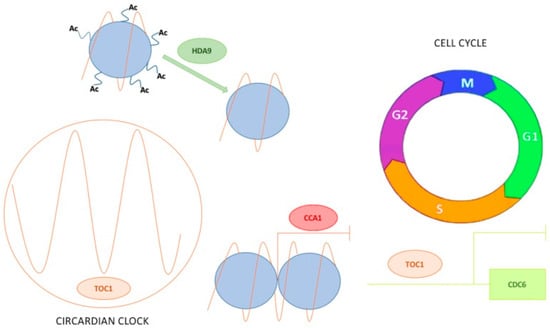 Epigenetic regulation of clock components and their role during cell cycle. (Left) Histone modifications modulate the rhythmic expression of clock genes: at dusk TIMING OF CAB EXPRESSION 1 (TOC1) expression increases due to hyperacetylation. Once TOC1 reaches its peak, the downregulation is accompanied by the action of the histone deacetylase HDA9 which facilitates CIRCADIAN CLOCK ASSOCIATED 1 (CCA1) mediated repression at the end of the day. (Right) At the transition between Gap 1 (G1) and duplication of DNA (S) phase, TOC1 regulates the progression of the cell cycle by repressing the expression of CELL DIVISION CONTROL 6 (CDC6) responsible for DNA replication.