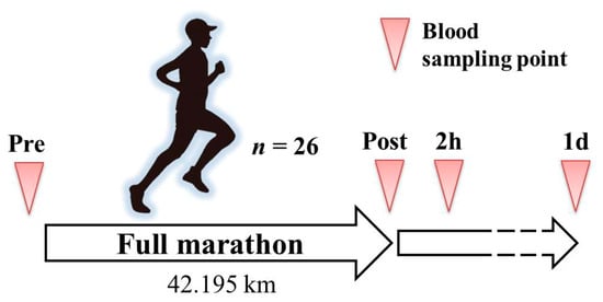 The outside air conditions on the day of the full marathon consisited of a temperature of 12.7 °C with a relative humidity level of 60.6%. Blood samples of the participants were collected into EDTA blood collection tubes at four time points, immediately before the marathon (Pre; also before warm-up), immediately after the marathon (Post), two hours after the marathon (2 h), and 1 day after the marathon (1 d). The participants were instructed to drink only water between the Post and 2 h collection points. The collected blood samples were centrifuged at 3000 rpm for 15 min at 4 °C. Aliquots of the plasma were then dispensed into 1.5 mL microtubes and stored at −80 °C until further analysis.