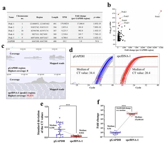 Bioinformatics analyses of the pooled plasma cfDNA collected at the Pre time point after the NGS run, identified spcfDNA sequences as significant top 5 peaks (Figure 3a). We chose to focus on the top peak of chromosome no. 1 based on the p-value and its expression (Figure 3b). This spcfDNA was referred to as spcfDNA-1. TPM and coverage values of the spcfDNA-1 region were approximately 17,600-fold higher than that of the gGAPDH region (Figure 3b,c). Consistent with these results, the median CT values on TaqMan-qPCR assay for the spcfDNA-1 on individual cfDNAs were lower than the median CT value of the gGAPDH fragments (Figure 3d). Additionally, standard deviations (SD) of the individual CT values upon duplicate measurements for the gGAPDH fragments were significantly higher than that of spcfDNA-1 fragments (Figure 3e). Additionally, the spcfDNA-1 fragments in individual cfDNAs were approximately 16,600-fold higher than the gGAPDH fragments as a median (Figure 3f).