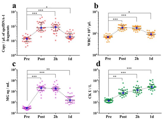 At the Post and 2 h time points, the levels of spcfDNA-1 fragments were significantly increased (median of 5-fold to 6-fold) compared to the Pre time point. Moreover, the amounts of spcfDNA-1 fragments remained slightly higher (1.3-fold) at the 1 d time point compared to the Pre time point (Figure 4a). WBC and MG values demonstrated similar dynamics to spcfDNA-1 values (Figure 4b,c), with the high values being confirmed at Post and 2 h time points. In contrast, the CK values exhibited different dynamics (Figure 4d), with high values being confirmed at the 1 d time point. Data regarding general markers have been published online in our previous study [13].