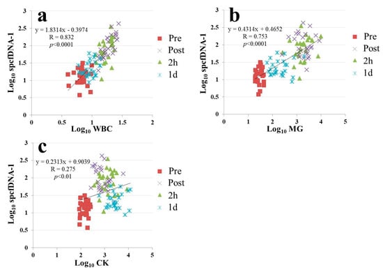 Correlation analyses between spcfDNA-1 and general stress markers. (a) WBCs and spcfDNA-1 (b) MG and spcfDNA-1 and (c) CK and spcfDNA-1.