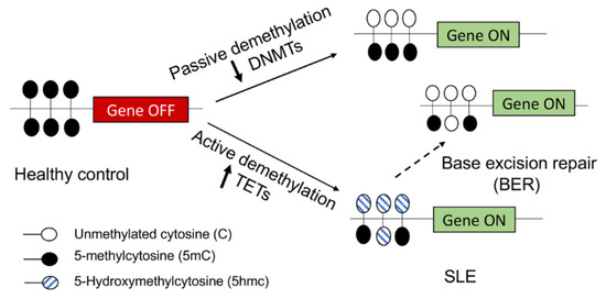 - Zhao, M.; Wang, J.; Liao, W.; Li, D.; Li, M.; Wu, H.; Zhang, Y.; Gershwin, M.E.; Lu, Q. Increased 5-hydroxymethylcytosine in CD4(+) T cells in systemic lupus erythematosus. J. Autoimmun. 2016, 69, 64–73. [Google Scholar] [CrossRef]