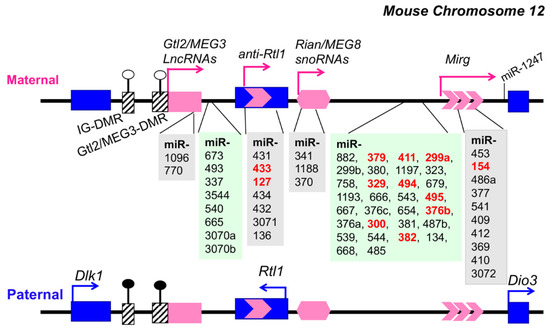 - Seitz, H.; Royo, H.; Bortolin, M.L.; Lin, S.P.; Ferguson-Smith, A.C.; Cavaille, J. A large imprinted microRNA gene cluster at the mouse Dlk1-Gtl2 domain. Genome Res. 2004, 14, 1741–1748. [Google Scholar] [CrossRef]