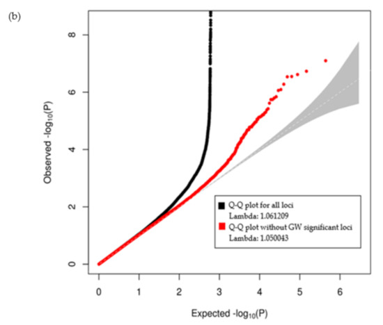 - Purcell, S.; Neale, B.; Todd-Brown, K.; Thomas, L.; Ferreira, M.A.R.; Bender, D.; Maller, J.; Sklar, P.; de Bakker, P.I.W.; Daly, M.J.; et al. PLINK: A tool set for whole-genome association and population-based linkage analyses. Am. J. Hum. Genet. 2007, 81, 559–575. [Google Scholar] [CrossRef]