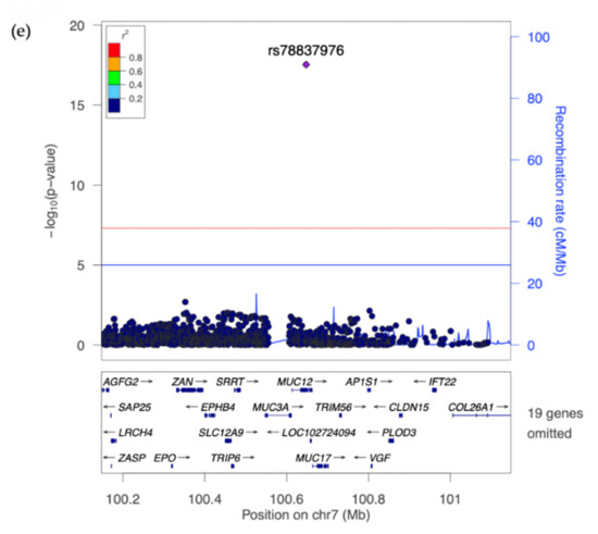 | rs28645997 | 7 | 100,352,470 | MUC12 | G | 0.4134 | rs78837976 | 9.87 × 10−5 | 1.0935 | 2.06 × 10−3 | 1.0870 | 4.26 × 10−3 |
