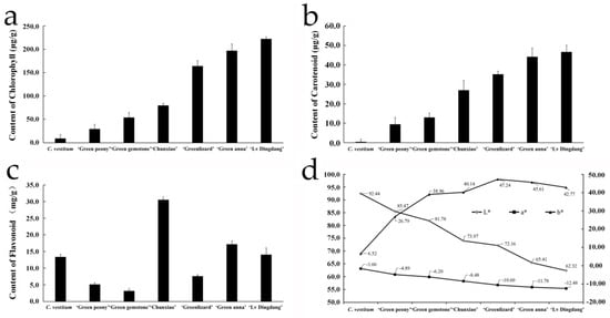 To understand the basis of green flower color in chrysanthemum, we determined the contents of major pigments in C. vestitum and six C. morifolium cultivars. From C. vestitum to chrysanthemum ‘Lv Dingdang’, the chlorophyll and carotenoid contents of flowers increased gradually, consistent with the change in flower color, but the change in flavonoid contents was not obvious. Additionally, the colorimeter analysis showed that as the flower color deepened in the seven materials, the ‘L’ value decreased from 92.46 to 62.32, indicating that the flower color gradually became darker. Similarly, the ‘a’ value declined steadily from −1.66 to −12.48, indicating a gradual deepening of the green color, while the ‘b’ value (which represents the yellow color) gradually increased from C. vestitum to C. morifolium ‘Greenlizard’, and then declined in C. morifolium ‘Green anna’ and ‘Lv Dingdang’ (Figure 2). These results suggest that chlorophyll is the main color-forming pigment in chrysanthemums with green flowers, and both chlorophyll and carotenoid affect the flower color in these materials.