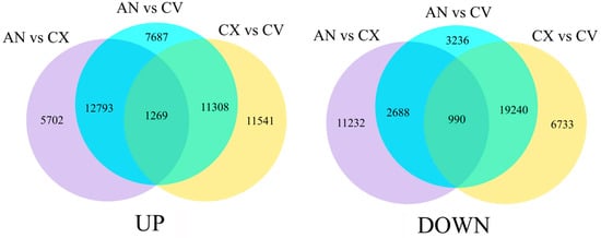 Venn diagrams showing the number of genes differentially expressed between C. vestitum (CV) and C. morifolium cultivars ‘Chunxiao’ (CX) and ‘Green anna’ (AN). The venn diagram on the left shows upregulated genes, and that on the right shows downregulated genes.