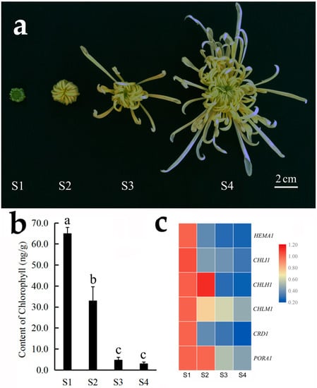 Content of chlorophyll and expression of chlorophyll synthesis related genes during flower opening in C. morifolium cultivar ‘Chunxiao’. (a) Different flower opening stages: stage 1 (S1), the outer-whorl ray florets are short, and therefore cannot wrap the inner disc florets; stage 2 (S2), inner disc florets are wrapped by the outer ray florets; stage 3 (S3), a few outer-whorl ray florets spread out; stage 4 (S4), more ray florets spread out, and the outer-whorl ray florets turn white. (b) Chlorophyll content. Data represent the mean ± SE of three biological replicates. (c) Heat map showing the expression of HEMA1, CHLI1, CHLH1, CHLM1, CRD1 and PORA1 at different stages of flower opening (S1–S4). The different colors represent gene expression levels determined by qRT-PCR analysis of three biological replicates.