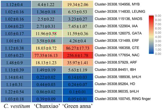 Expression of candidate transcription factor-encoding genes in C. vestitum and C. morifolium cultivars ‘Chunxiao’ and ‘Green anna’. The different colors represent gene expression levels determined by qRT-PCR. Data represent the mean ± SE of three biological replicates.