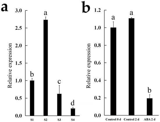 The expression of Cluster-35308.177654 (NAC) was further examined in the flowers of C. morifolium cultivars ‘Chunxiao’ (at different opening stages) and ‘Lv Dingdang’ (treated with or without ABA). In ‘Chunxiao’, the expression of Cluster-35308.177654 (NAC) increased significantly from stage 1 to stage 2 and then declined gradually from stage 2 to stage 4. In ‘Lv Dingdang’, ABA treatment significantly decreased the expression of Cluster-35308.177654 (Figure 6).