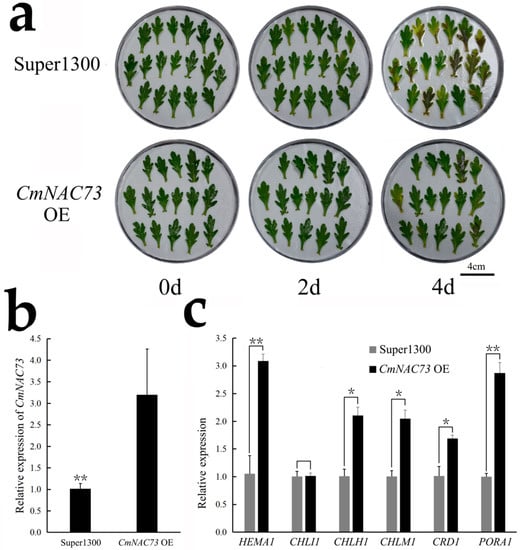 Next, we transiently overexpressed CmNAC73 in the leaves of C. morifolium cultivar ‘Lv Dingdang’. Leaves overexpressing CmNAC73 exhibited delayed yellowing and significantly higher expression of HEMA1, CHLI1, CHLM1, CRD1 and PORA1 compared with leaves expressing the Super1300 empty vector control (Figure 7).