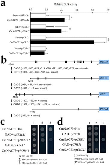 Previous studies have shown that NAC transcription factors bind to the core sequence CACG or CGTG [28,29]. In this study, 13, 5, 6 and 1 putative NAC-binding sites were found in the promoters of HEMA1, CHLI1, CRD1 and PORA1, respectively (Figure 8b). To test whether CmNAC73 binds to the promoters of HEMA1, CHLI1, CRD1 and PORA1, we performed a yeast one-hybrid assay. When pHEMA1-His and pGAD-CmNAC73 were co-transferred into yeast, the positive clone of yeast cells could grow normally on SD/-Leu-Trp-His, supplied with 4 mM 3-AT, while the yeast carrying pGAD and pHEMA1-His could not grow, which suggested CmNAC73 have a weak binding to the HEMA1 promoter. Additionally, CmNAC73 showed strong binding to the promoter of CRD1, and 70 mM 3-AT can completely inhibit the expression of HIS gene in the combination of GAD + pCRD1, whereas CmNAC73 + pCRD1 could grow normally (Figure 8c,d).