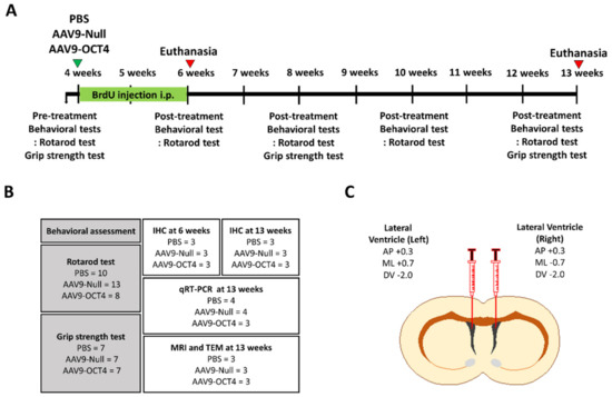 At 4 weeks of age, mice were anesthetized with intraperitoneal (IP) injection of ketamine (100 mg/kg; Huons, Gyeonggi-do, Korea) and xylazine (10 mg/kg; Bayer Korea, Seoul, Korea). A stereotaxic procedure was performed at 4 weeks of age in which the mice received both lateral ventricle (LV) injections (1 × 1012 vg/mL, 1 μL each) using the following stereotaxic coordinates: AP +0.3 mm from bregma, ML +0.7/−0.7 mm from bregma, and DV −2.0 mm from dura mater (Figure 1C). AAV9 vector (ViroVek, Hayward, CA, USA) containing human OCT4-HA tag was expressed using the CMV promotor (Figure S1A). Mice were randomly assigned to one of the following groups: PBS, AAV9-Null, or AAV9-OCT4 treatment.