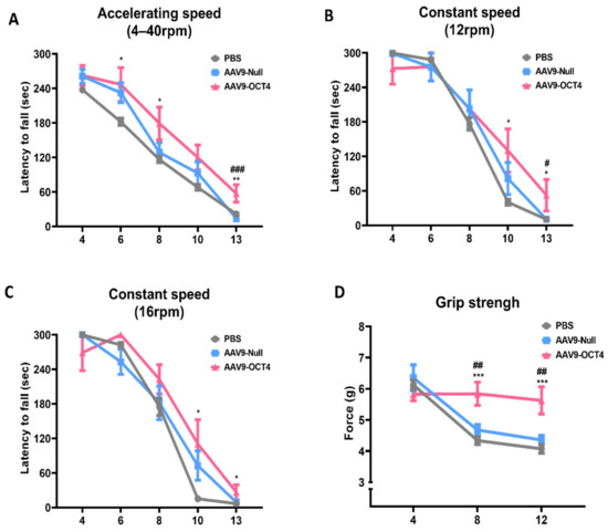 The AAV9-OCT4 group showed a significant increase in latency compared to the control groups in the accelerating speed rotarod test (4–40 rpm) at 6 weeks (PBS = 181.9 ± 19.5, AAV9-Null = 232.4 ± 16.8, AAV9-OCT4 = 246.7 ± 27.6 s), 8 weeks (PBS = 116.4 ± 16.8, AAV9-Null = 128.7 ± 16.2, AAV9-OCT4 = 179.2 ± 26.5 s), 13 weeks of age (PBS = 21.7 ± 4.6, AAV9-Null = 13.9 ± 4.1, AAV9-OCT4 = 57.4 ± 14.2 s) (Figure 2A) and constant speed rotarod test (12 rpm) at 10 weeks (PBS = 40.3 ± 16.2, AAV9-Null = 81.3 ± 28.0, AAV9-OCT4 = 130.1 ± 37.8 s), 13 weeks (PBS = 10.3 ± 2.6, AAV9-Null = 10.7 ± 2.8, AAV9-OCT4 = 52.4.1 ± 27.4 s) (Figure 2B) and in the constant speed rotarod test (16 rpm) at 10 weeks (PBS = 15.1 ± 2.7, AAV9-Null = 72.7 ± 25.5, AAV9-OCT4 = 110.6 ± 42.0 s), 13 weeks (PBS = 6.7 ± 1.6, AAV9-Null = 9.1 ± 1.9, AAV9-OCT4 = 26.4.1 ± 12.8 s) (Figure 2C). In our results, behavioral recovery by OCT4 treatment was observed near 13 weeks of age. The previous study reported that proceeding to late disease stage, which is considered as a humane endpoint, can be acceptable in the form of treatment for these stage [41]. Therefore, we established the endpoint of this study to confirm therapeutic effects.
