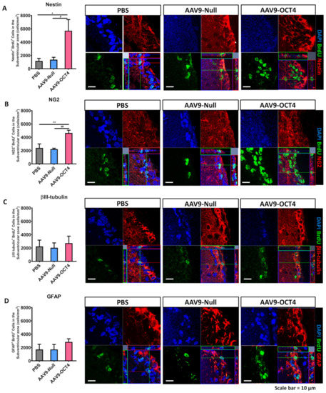 In the SVZ, the numbers of Nestin+BrdU+ (PBS = 1.17 ± 0.4, AAV9-Null = 1.4 ± 0.4, AAV9-OCT4 = 5.7 ± 1.8 (×103 cells/mm3)) (Figure 3A) and NG2+BrdU+ (PBS = 2.4 ± 0.7, AAV9-Null = 2.2 ± 0.2, AAV9-OCT4 = 4.6 ± 0.5 (×103 cells/mm3)) (Figure 3B) cells were significantly higher in the AAV9-OCT4 group than the controls at 2 weeks post-treatment. The numbers of βIII-tubulin+BrdU+ (PBS = 2.2 ± 1.0, AAV9-Null = 2.0 ± 0.8, AAV9-OCT4 = 2.7 ± 1.2 (×103 cells/mm3)) (Figure 3C) and GFAP+BrdU+ (PBS = 1.7 ± 0.9, AAV9-Null = 1.7 ± 0.8, AAV9-OCT4 = 2.8 ± 0.5 (×103 cells/mm3)) (Figure 3D) cells did not significantly differ among the three groups at 2 weeks post-treatment.