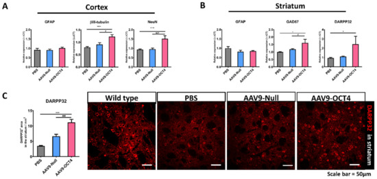 The expression of βIII-tubulin, NeuN, glutamic acid decarboxylase 67 (GAD67), DARPP32 and GFAP was confirmed by qRT-PCR at 13 weeks of age. AAV9-OCT4 group displayed significantly increased not only expression of βIII-tubulin and NeuN, a neuronal marker in the cortex but also GAD67 and DARPP32, a GABAergic neuronal marker in the striatum. However, the AAV9-OCT4 group did not change the expression of GFAP, an astrocytic marker in both regions (Figure 6A,B). In addition, DARPP-32+ GABAergic neurons of the striatal region significantly increased in AAV9-OCT4 group compared to control groups (PBS = 3.48 ± 0.16, AAV9-Null = 6.68 ± 0.62, AAV9-OCT4 = 11.17 ± 1.00) using confocal microscopy (Figure 6C). OPCs have been shown to express various growth factors and cytokines that play a significant role in cell functions and survival [50,51]. Previous studies reported that GDNF, mainly released by OPCs and oligodendrocytes, can promote neuronal cell survival as well as axon regeneration and myelination in demyelinating conditions [50,52]. Taken together, these results raise the potential that OCT4 overexpression not only ameliorates myelination deficits but also induces striatal neuroprotection in HD.