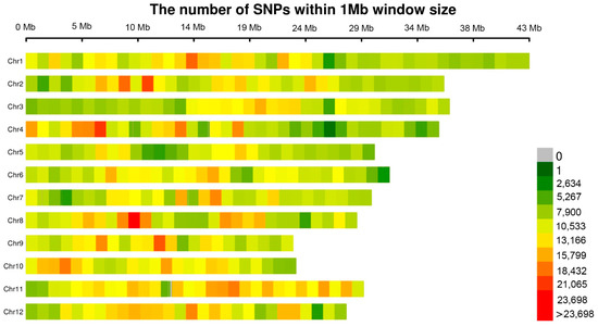 We have a total of 4,076,837 high-quality SNPs distributed across 12 chromosomes. The number of markers on each chromosome varies, with chromosome 9 having the least (260,134) markers and chromosome 1 having the most (457,835). The size of chromosome varied from 22.9 Mb for chromosome 9 to 43.2 Mb for chromosome 1. In addition, the mean distribution space of SNPs on chromosomes ranged from 0.076 kb on chromosome 11 to 0.106 kb on chromosome 5 (Table 1). Overall, the SNPs are evenly distributed, the number of SNPs within 1 Mb window size almost near 10,000 (Figure 2).