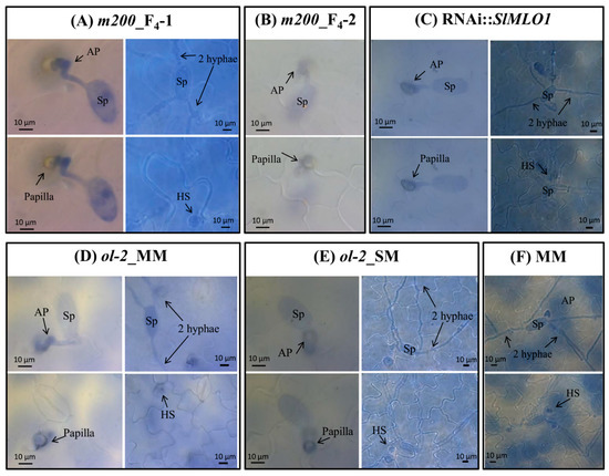Compared to MM, fungal growth on all individuals of the M200 mutant was considerably reduced due to the formation of a papilla beneath the appressorium (Figure 4 and Table 1). In MM, hardly any papillae were formed. In contrast, the percentage of papilla formation per infection unit (IU) was higher than 32% in the mutant genotypes, varying from 32.7% in the m200_F4-2 to 71.6% in RNAi::SlMLO1 (Figure 4 and Table 1). Simultaneously, the percentage of haustorium formation per infection unit was drastically decreased in all the tested mutant genotypes compared to MM. No haustoria were observed in m200_F4-2, while in the other mutants haustoria were observed at a rate of 10.3% in m200_F4-1, 4.4% in ol-2_MM, 11% in ol-2_SM, and 5.5% in RNAi::SlMLO1 (Figure 4 and Table 1).
