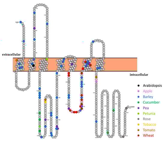 - Elliott, C.; Müller, J.; Miklis, M.; Bhat, R.A.; Schulze-Lefert, P.; Panstruga, R. Conserved extracellular cysteine residues and cytoplasmic loop–loop interplay are required for functionality of the heptahelical MLO protein. Biochem. J. 2005, 385, 243–254. [Google Scholar] [CrossRef] [PubMed]