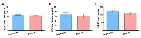 Epigenetic mechanisms, which could be dysregulated by environmental factors, are increasingly discovered to be involved in the pathogenesis and progression of PD [8]. Indeed, several studies revealed global and gene-specific epigenetic changes in the nuclear genome from brain regions of PD animal models and in post-mortem brain regions and peripheral blood from PD patients [9]. Recent evidence suggests that also epigenetic modifications of the mitochondrial genome could contribute to neurodegeneration [10]. In this regard, dysregulation of mitochondrial DNA (mtDNA) methylation in the central nervous system and in peripheral blood samples of patients with AD, PD, and amyotrophic lateral sclerosis (ALS), as well as in transgenic mice modelling, has been reported [11,12,13,14,15,16]. The majority of these studies investigated the methylation levels of the mtDNA regulatory region (D-loop), which regulates mtDNA replication and transcription, revealing that D-loop methylation levels were dynamically dysregulated with disease progression in animal models of AD and were significantly different in human postmortem AD brains and in peripheral blood cells of living AD patients compared to healthy controls [12,13,15]. Altered D-loop methylation levels were also detected in spinal cord and skeletal muscle cells of human-SOD1 transgenic ALS mice [11] as well as in peripheral blood of familial and sporadic ALS patients [14,16]. Moreover, an inverse correlation between D-loop methylation levels and mtDNA copy number was frequently observed [14,16,17,18,19], suggesting a role for methylation levels in this region in regulating mtDNA replication. Regarding PD, a significant reduction of D-loop methylation levels was observed post-mortem in the substantia nigra of individuals with PD compared to healthy controls [12]. More recently, a study performed in platelet mtDNA did not find differences in the methylation levels of MT-TL1, MT-CO1, MT-CO2, and MT-CO3 mitochondrial genes between PD patients and control subjects [20]. However, nothing is yet known about D-loop region methylation levels in peripheral blood of PD patients.