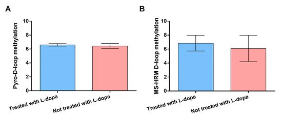 In Figure 2A,B are reported results on the effects of use of L-dopa on D-loop methylation levels evaluated by means of pyrosequencing and MS-HRM, respectively. No significant difference in pyrosequencing D-loop methylation levels was observed between PD patients treated or not treated with L-dopa (6.43 ± 0.35 vs. 6.59 ± 0.18, p = 0.71). Similarly, no significant difference was observed in MS-HRM D-loop methylation levels between the two aforementioned groups (6.09 ± 1.88 vs. 6.85 ± 1.20, p = 0.73).