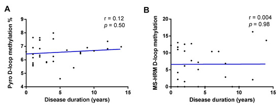 Correlation between disease duration (in years) and D-loop region methylation levels evaluated by means of pyrosequencing (A) and MS-HRM (B). The correlation was analyzed using Pearson’s correlation coefficient.