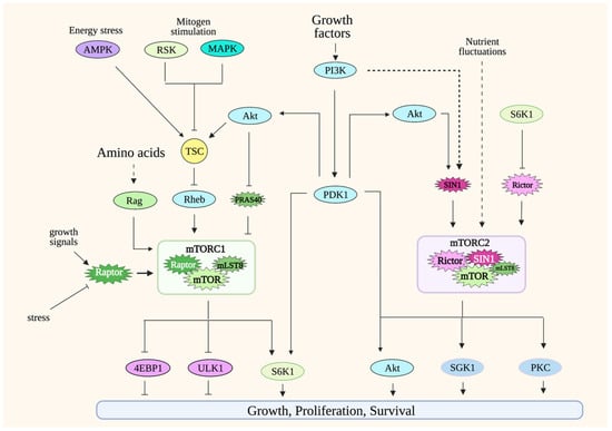 Since mTOR signaling has been extensively reviewed elsewhere [,,], here, we will only give a general overview of mTORC1 and mTORC2 signaling.