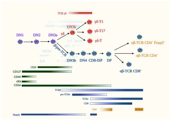 All T cells originate from bone marrow-derived hematopoietic stem cells (HSCs) that migrate into the thymus at this organ’s corticomedullary junction. In the thymus, signaling through the Notch family of receptors differentiate HSCs into thymocytes (the immature precursors of naive T cells) and commits them to the T cell lineage. Two major T lineages emerge from thymocyte maturation: the αβ- and γδ-T cells defined by their respective expression of αβ- or γδ-T cell receptor (TCR) complexes (Figure 3) [,]. Lineage immature thymocytes, characterized as CD4-CD8- double-negative 1 (DN1) and “lineage negative” [NK1.1− (NK marker), B220− (B cell marker), TER119− (erythroid marker), Gr1− (neutrophil marker) and CD3ε− (T cell marker)], express CD44, cKit and CD24 but not CD25. The induction of CD25 expression marks the entry into the double-negative 2 (DN2; CD4-CD8-) stage of thymocyte development. At DN2, the expression of recombination-activating genes Rag1 and Rag2 drives the recombination of the V(D)J segments of the β-, γ- or δ-TCR gene loci and thymocyte maturation continues into the double-negative 3 (DN3; CD4-CD8-) stage. At DN3, thymocytes commit irreversibly to the T cell lineage, which is characterized by alterations in the ratio of specific transcription factor family members Runx3/Runx1, Gfi1B/Gfi1 and PU.1/SpiB, indicating changes in the transcriptional network. Similarly, distinct chromatin landscape and accessibility account in part for the divergence of γδ- and αβ-T cell lineages [].