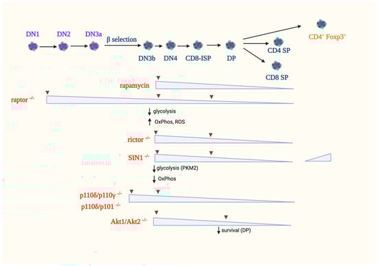 Studies using rapamycin provided initial clues on the role of mTOR in T cell development in the thymus. In mice, rapamycin treatment leads to thymic atrophy due to diminished proliferation without increasing apoptosis [,]. Rapamycin treatment in vivo blocks the DN3 to DP differentiation []. However, it does not affect negative selection []. In rats, thymic atrophy also occurs but recovers after a few weeks upon cessation of rapamycin treatment []. Rat DP thymocytes, but not the DN and SP subsets, have accelerated apoptosis []. While these studies unraveled the involvement of mTOR in early thymocyte development, they do not distinguish whether the effects are due to inhibition of mTORC1 and/or mTORC2 signaling, since rapamycin is an allosteric inhibitor that only blocks some of mTORC1 functions. Furthermore, prolonged rapamycin treatment may also disrupt mTORC2 assembly []. Hence, to delineate the specific functions of mTORC1 and mTORC2 in thymocyte development, genetic experiments that ablate mTORC components and their downstream effectors have provided better insights on the specific role of mTORC1 and mTORC2 signaling, as discussed below (Figure 4).