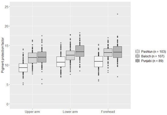 Boxplots of skin pigmentation measurements (pigment protection factor) of the upper arm, lower arm, and forehead in three Pakistani subpopulations. The pigment protection factor was measured in triplicate at each measured skin area.