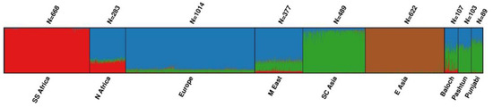 The pairwise genetic distances calculated among the three subpopulations were statistically significantly different (Supplementary Table S3). The Baloch were more distant from Punjabis and Pashtuns than Punjabis were from Pashtuns. The results agreed with our previous results obtained with short tandem repeats that depicted genetic differences between the Baloch and other subpopulations from Pakistan [31]. The STRUCTURE analysis (Figure 2) showed that all three subpopulations from Pakistan were admixed, mainly with South-Central Asian and European genetic contributions. However, the Baloch population also had a genetic contribution from Sub-Saharan African populations, which may be remnants of African individuals settling in the Indian subcontinent [32,33].