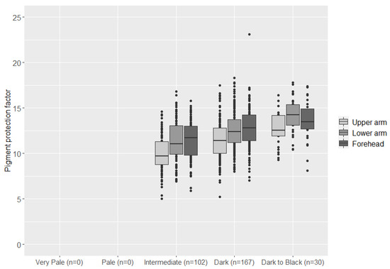 Boxplots showing the skin color category predicted with the HIrisPlex-S prediction model and the pigmentation protection factor on the upper arm, lower arm, and forehead.