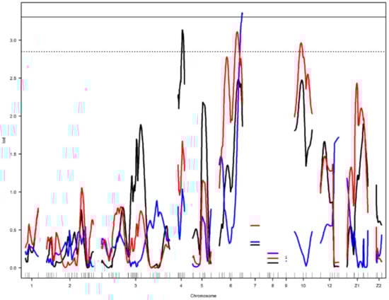 Genome-wide LOD plot of detected QTL for egg long axis1 (black) on chromosome 4, yolk weight1 (red) on chromosomes 6 and 10, and egg shell strength1 (blue) on chromosome 6. The horizontal lines show the genome-wide significance at 5% (straight line) and suggestive threshold at 10% (dotted line) levels.