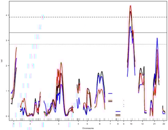 Genome-wide LOD plot of detected QTL for egg weight1 (black) and albumen weight1 (red) on chromosome 10, and egg short axis1 (blue) on chromosomes 10 and Z1. The horizontal lines show the genome-wide significance threshold at 1% (dashed line) and 5% (straight line) and suggestive threshold at 10% (dotted line) levels.