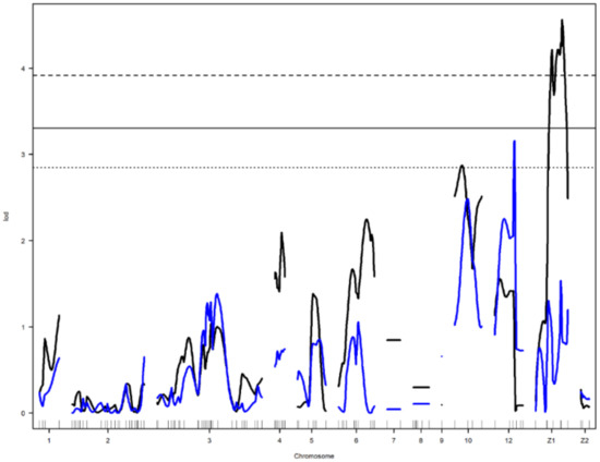 Genome-wide LOD plot of detected QTL for egg shell weight1 (blue) on chromosome 12 and yolk diameter1 (black) on chromosome Z1. The horizontal lines show the genome-wide significance threshold at 1% (dashed line) and 5% (straight line) and suggestive threshold at 10% (dotted line) levels.