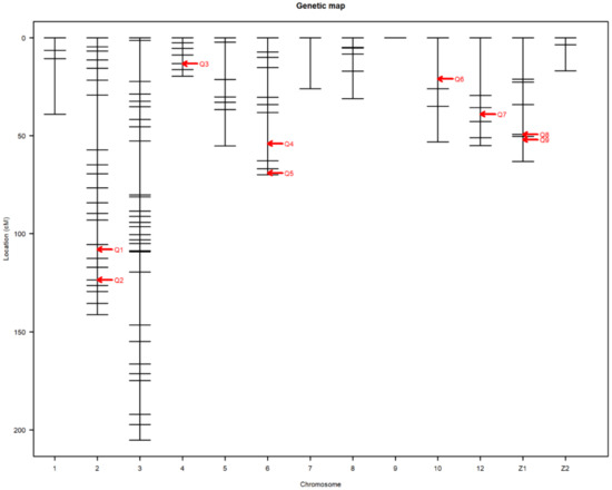 Detected QTL presented in the genetic map. The abscissa shows the chromosome number. The ordinate represents the position of the markers based on cM. Q stands for the QTL number.