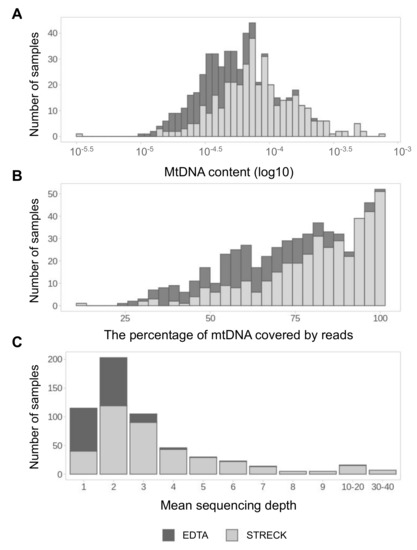 The quantitative analysis of the mtDNA pool in samples. MtDNA content (A), mtDNA coverage (B) and sequencing depth (C) distribution in samples collected to EDTA (dark-grey) and Streck (light-grey) sample tubes.