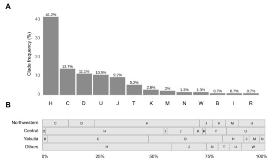 Next, we explored how this distribution changes from region to region (Figure 6B). We revealed that haplotypes of H superclade are top-frequent in all regions except for Yakutia, where most samples have haplogroups of superclades C (45%) and D (33%).