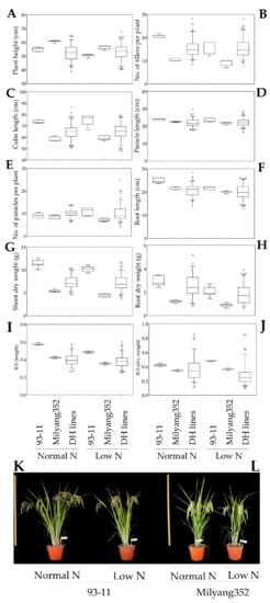Genotype–phenotype correlation of the doubled haploid population and parental lines under normal and low nitrogen cultivation conditions. (A) The box plot displays the effects of a low nitrogen (N) cultivation regime on the growth of 93-11 (P1, indica), Milyang352 (P2, japonica), and that of a doubled haploid (DH) rice population (n = 117) compared to the normal N application, (B) box plot showing the number of tillers per plant, (C) culm length, (D) panicle length, (E) number of panicles per plant, (F) root length, (G) shoot dry weight, (H) root dry weight, (I) root–shoot (R:S) ratio calculated from the root length and plant height, and (J) based on the root dry weight and shoot dry weight of the same population, and (K,L) phenotypes of 93-11 (P1) and Milyang352 (P2) under the same conditions.