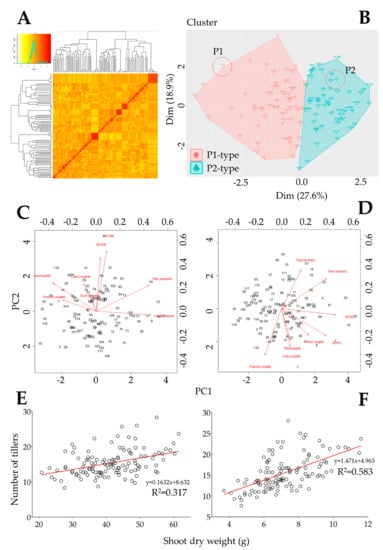 Population genome background and principal component analysis results. (A) The density map of pairwise kinship matrix values generated based on 240 KASP markers on a DH population, (B) cluster plot showing the distinctive phenotypic response between P1 (93-11) and P2 (Milyang352) based on the number of tillers under low N cultivation, (C,D) 2D principal component analysis (PCA) indicating the relationship between traits, and (E,F) linear regression analysis proposing the existence of a positive correlation between number of tillers and shoot dry weight in rice grown under a normal and low N cultivation regime, respectively.