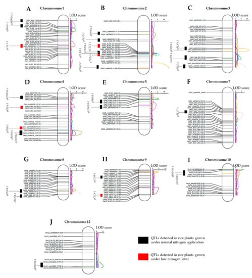 Linkage maps and identified QTLs associated with various agronomic traits in rice under normal and low nitrogen cultivation. Five (5) QTLs (qPHN-1, 43 cM; qPHN3-1, 166 cM; qPHN5-1, 23 cM; qPHN10-1, 1 cM; and qPHN12-1, 130 cM) associated with plant height of rice were mapped on five (5) different chromosomes, for normal nitrogen cultivation. The QTLs associated with tiller number were mapped on chromosome 2 (qTNN-1, 130 cM for normal nitrogen cultivation, and qTNL2-1, 134 cM for low nitrogen cultivation) and chromosome 4 (qTNN4-1, 173 cM). For both normal and low nitrogen cultivation conditions, five QTLs (qCLN2-1, 132 cM; qCLN2-2, 187 cM; qCLN3-1, 128 cM; qCLN9-1, 9 cM; and qCLN10-1, 17 cM) and two (2) QTLs (qCLL1-1, 108 cM; and qCLL9-1, 72 cM) were mapped on four and two chromosomes, respectively. Five QTLs (qPLN2-1, 74 cM; qPLN3-1, 123 cM; qPLN3-2, 201 cM; qPLN7-1, 89 cM; and qPLN8-1, 101 cM) associated with panicle length under normal nitrogen cultivation were mapped on four chromosomes. Three QTLs (qPNN2-1, 53 cM; qPNN4-1, 169 cM; qPNN8-1, 84 cM) and one QTL (qPNL4-1, 154 cM) associated with panicle number were mapped on three chromosomes and one chromosome, for normal nitrogen and low nitrogen cultivation, respectively. A unique QTL (qRLL4-1, 59 cM) associated with root length was mapped on chromosome 4. Finally, one QTL (qSDWN-51, 46 cM) and two QTLs (qRDW1-1, 27 cM; and qRDW4-1, 21 cM) associated with shoot dry weight (SDW) and root dry weight, respectively, under normal nitrogen cultivation, were mapped to chromosomes 5 (for SDW) and 1 and 4 (for RDW). (A–J) Chromosomes 1, 2, 3, 4, 5, 7, 8, 9, 10, and 12. LOD score, logarithm of the odds indicating the significance of genetic linkage between markers and the detected QTLs above a threshold.