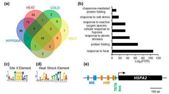 Identification of enriched cis-element in the promoter of HEAT SHOCK FACTOR A2 (HSFA2)-coregulated genes. (a) Venn diagram representing the intersection between genes identified as positively regulated with HSFA2 during cold, salt, heat, and hypoxia stress. (b) GO term enrichment of the 43 genes in the HSFA2 common stress cluster. (c) SII element (WWWTGGGCCT) and (d) Heat Shock Element (MWRGAWGTTTCTAGA) DNA motifs enriched in the promoter of the 43 HSFA2 common stress cluster. (e) Schematic representation of HSFA2 promoter featuring TATA box (−23), HSEs (−33; −77; −133) and SII (−186; −201; −250).