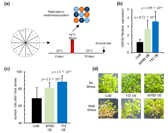 TRANSPARENT TESTA 2 (TT2) and MYB5 overexpression triggers upregulation of HEAT SHOCK FACTOR A2 (HSFA2) in planta and provides heat resistance. (a) Schematic representation of the resistance assay protocol. Each stress is applied on three identical petri dishes placed in randomized positions in the growth chamber. Lines were sowed symmetrically in vitro and grown in control conditions for six days. Heat stress consisted of 80 min at 44 °C. Survival rates were observed after 10 days. (b) HSFA2 expression in transgenic TT2 or MYB5 overexpressors (OEs) plants. Results are the mean of three independent measurements. Errors bars represent standard deviations (SD). Results are significant with p-values < 0.05 (Wilcoxon test). (c) Survival rates of TT2 OEs and MYB5 OEs plants after heat stress. Histograms present the mean of three independent measurements. Each measurement is the average of six randomized technical replicates. Error bars represent SD. p-values were obtained from Student’s t-test. (d) Representative pictures of two-week-old TT2 OEs and MYB5 OEs plants grown in control and heat stress conditions.