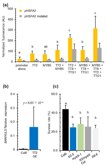 The entire MYB–BHLH–WDR (MBW) complex is required for HEAT SHOCK FACTOR A2 (HSFA2) regulation and heat stress resistance in vegetative organs. (a) Physcomitrella patens protoplast transient transformation assays. HSFA2 promoter or the mutated HSFA2 promoter version lacking the three SIIelement were co-transformed in moss protoplasts with different transcription factors composing the MBW complex. Total fluorescence was normalized by the number of protoplasts per transformation. Differences between wild type and mutated promoter activities are all significantly different with p-values < 0.03. (b) BANYULS (BAN) expression in five independent TRANSPARENT TESTA 2 (TT2) overexpressors. (c) Heat stress resistance potential of Col-0 compared to tt2-5 and myb5-1 and the double mutant tt2/myb5 backcrossed three times in Col-0 (tt2/myb5 Col). Histograms are the mean of three independent experiments, each consisting of the average of six randomized technical replicates. p-values were obtained by the Student’s t-test and error bars represent SDs. Letters indicate statistical significance with p-values < 0.05.