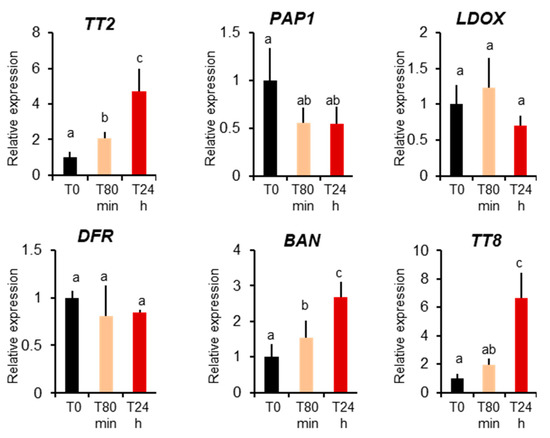 MYB–BHLH–WDR component and target expression during heat stress. Col 0-plants were collected before heat stress (T0), after 80 minutes of heat stress (T80min) and the next day (T24h). Gene expression was measured using real-time quantitative PCR. Results are the means of six independent experiments. Bars represent standard errors. Different letters indicate the statistical significance with p-values < 0.05 (Student’s t-test).