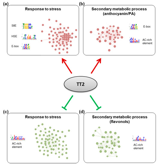 Gene regulatory networks (GRNs) regulated by TRANSPARENT TESTA 2 (TT2) overexpressors (OE). GRNs were constructed from differentially expressed genes in TT2 OEs. (a) Upregulated genes belonging to the “response to stress” gene ontology (GO) category belong to a tightly coregulated set of genes including HEAT SHOCK FACTOR A2, A3, A7A, MULTIPROTEIN BRIDGING FACTOR 1C, and many chaperones. Promoters of these genes were found to be enriched in SII element, heat shock element and E-box motifs. (b) Upregulated genes belonging to the “secondary metabolic process” GO category formed another network including multiple flavonoids biosynthesis genes (BANYULS, LEUCOANTHOCYANIDIN DIOXYGENASE, TRANSPARENT TESTA 5 and 6, etc…). Promoters of these genes were enriched in E-box and a motif similar to the AC-rich element. A comparable AC-rich element motif was enriched in downregulated GRNs (c,d).