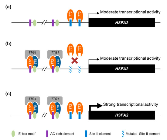 Proposed model of HEAT SHOCK FACTOR A2 (HSFA2) promoter regulation by TRANSPARENT TESTA 2 (TT2) and MYB5. (a) When expressed alone, TT2 and MYB5 are able to drive a moderate transcriptional activity mostly dependent on the SII element (SIIE). (b) Together with the other members of the MYB–BHLH–WDR (MBW) complex, TRANSPARENT TESTA 8 (TT8) TRANSPARENT TESTA GLABRA 1 (TTG1), TT2 acquires new DNA binding specificities. When the SIIE is mutated, the MBW complex is still able to induce a moderate transcriptional activity through the E-box and AC-rich element motifs. (c) The concerted action of TT2-TT8-TTG1 and TT2 or MYB5 monomers trigger a strong activation of the HSFA2 promoter. For simplicity, we represent the different proteins as regulating transcription through direct DNA binding.