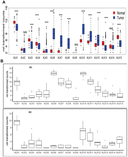 - Tailor, P.D.; Kodeboyina, S.K.; Bai, S.; Patel, N.; Sharma, S.; Ratnani, A.; Copland, J.A.; She, J.X.; Sharma, A. Diagnostic and prognostic biomarker potential of kallikrein family genes in different cancer types. Oncotarget 2018, 9, 17876–17888. [Google Scholar] [CrossRef] [PubMed]